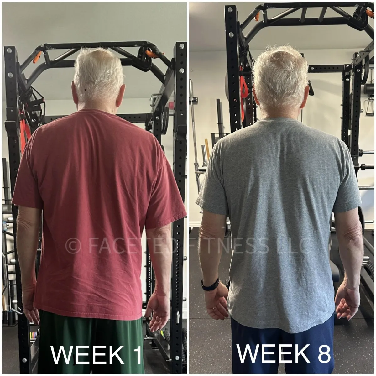 After 8 weeks of incorporating some strategically programmed corrective, mobility, and activation drills into his warmups during his 30-minute sessions twice a week, shoulders had leveled out and he's bowling like a pro in his 70s!